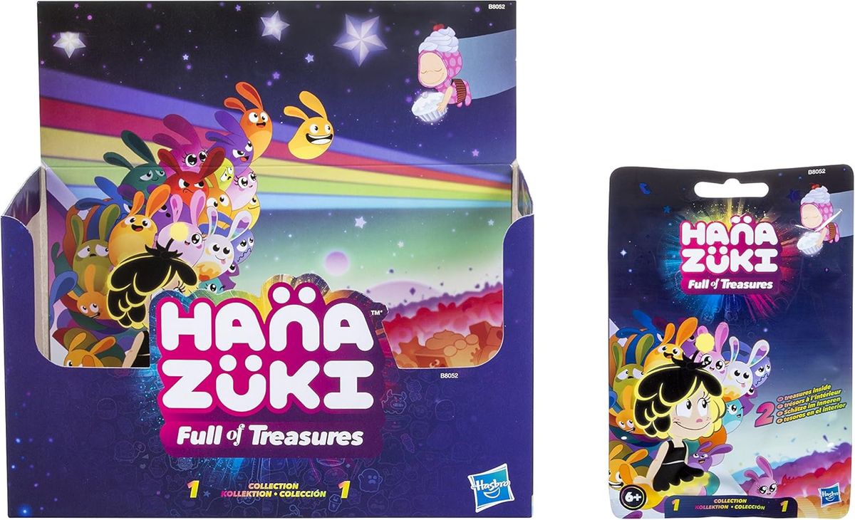 Ogni confezione sorpresa include due tesori stravaganti e colorati. Sbloccali con l'app Hanazuki. Applica i tesori al braccialetto per esprimere il tuo entusiasmo e aggiungere un tocco di colore. Ci sono 96 tesori da collezionare. Basato sulla serie animata di YouTube, "Hanazuki: Full of Treasures" è una webserie animata Hasbro in cui le emozioni, inclusa la sorpresa, sono al centro della trama. Sorpresa nella serie Nell'universo di Hanazuki, le emozioni sono potenti e necessarie per proteggere la sua luna e la galassia da una forza oscura che minaccia di rubarne il colore e l'armonia. La protagonista, Hanazuki, deve imparare a provare ed esprimere una vasta gamma di emozioni per coltivare "tesori" (oggetti colorati con facce buffe) che usa per proteggere il suo mondo. La sorpresa è un'emozione importante rappresentata da uno stato d'animo specifico, spesso associato al colore viola nei personaggi noti come Hemka. Questa emozione, come tutte le altre, è vitale per l'equilibrio della sua luna.