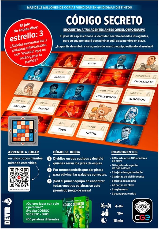 "Code Names" è un gioco di parole a squadre in cui i giocatori devono indovinare le parole che si riferiscono ai propri agenti segreti sulla base di indizi composti da una sola parola forniti dal loro capospia. Ogni squadra compete per essere la prima a identificare tutti i propri agenti sulla griglia di 25 parole, ma deve fare attenzione a non scegliere l'assassino, poiché ciò porrebbe fine alla partita immediatamente con la sconfitta della squadra. Il capospia chiamerà un numero, che indicherà ai compagni di squadra quanti nomi in codice sono correlati a quell'indizio. Gli agenti sul campo cercheranno di indovinare a quale parola o parole si riferisce il loro capospia. Quando un agente tocca una parola, il capospia ne rivelerà l'identità segreta. "Code Names" è un gioco da tavolo competitivo a squadre che combina intrigo e deduzione, in cui due squadre di spie devono smascherare i propri agenti segreti prima della squadra avversaria. I leader di ogni squadra conoscono le identità segrete degli agenti, ma gli altri giocatori conoscono solo i loro nomi in codice. Il gioco consiste nel fornire indizi composti da una singola parola e un numero ai compagni di squadra, che dovranno indovinare le parole corrette su una griglia 5x5. Come si gioca Preparazione: Posizionate sul tavolo una griglia 5x5 con carte parola disposte casualmente. Divisione: Dividetevi in due squadre e ogni squadra sceglie un leader (capo spia). Carta codice: Solo i leader possono vedere una carta codice che indica loro quali parole appartengono alla propria squadra, quali alla squadra avversaria, quali sono civili neutrali e quale è l'assassino. Turni: A turno, il leader di ogni squadra fornisce un indizio composto da una singola parola e un numero. La parola è l'indizio e il numero indica quante parole sul tavolo si riferiscono a quell'indizio. Ad esempio, "animale: 3" indica che ci sono tre parole relative a un animale. Indovinare: I compagni di squadra devono indovinare le parole corrette. Se indovinano correttamente, possono riprovare (fino a un numero di volte pari al numero dell'indizio più uno). Errori: Se una squadra indovina una parola appartenente alla squadra avversaria o a un civile, il suo turno termina. Se indovina l'assassino, perde immediatamente la partita. Vittoria: La prima squadra a identificare correttamente tutte le proprie parole vince.