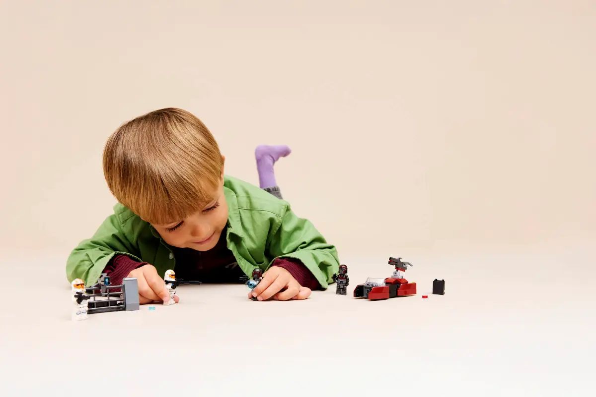Regala al tuo bambino un fantastico Battle Pack (75449) per ricreare la sua versione del drammatico Assedio di Mandalore di Star Wars: The Clone Wars! Questo set di costruzione include 4 minifigure LEGO® Star Wars™: 2 Super Commando Mandaloriani e 2 versioni del 332° Clone Trooper di Ahsoka, uno Speeder Mandaloriano, la barricata dei Clone Trooper e accessori. Attiva il blaster dello speeder e rispondi al fuoco con il cannone montato sulla barricata. Monta i jetpack dei Commando per attaccare dall'alto con le loro pistole blaster. Ricco di elementi che stimolano l'immaginazione dei bambini, questo giocattolo è un regalo perfetto per bambini, bambine e fan di Star Wars dai 6 anni in su. Cerca altri set Battle Pack (venduti separatamente) per ampliare le possibilità di gioco. I bambini possono costruire con sicurezza utilizzando l'app LEGO® Builder, che fornisce accesso a istruzioni digitali facili da seguire. Contiene 116 pezzi.