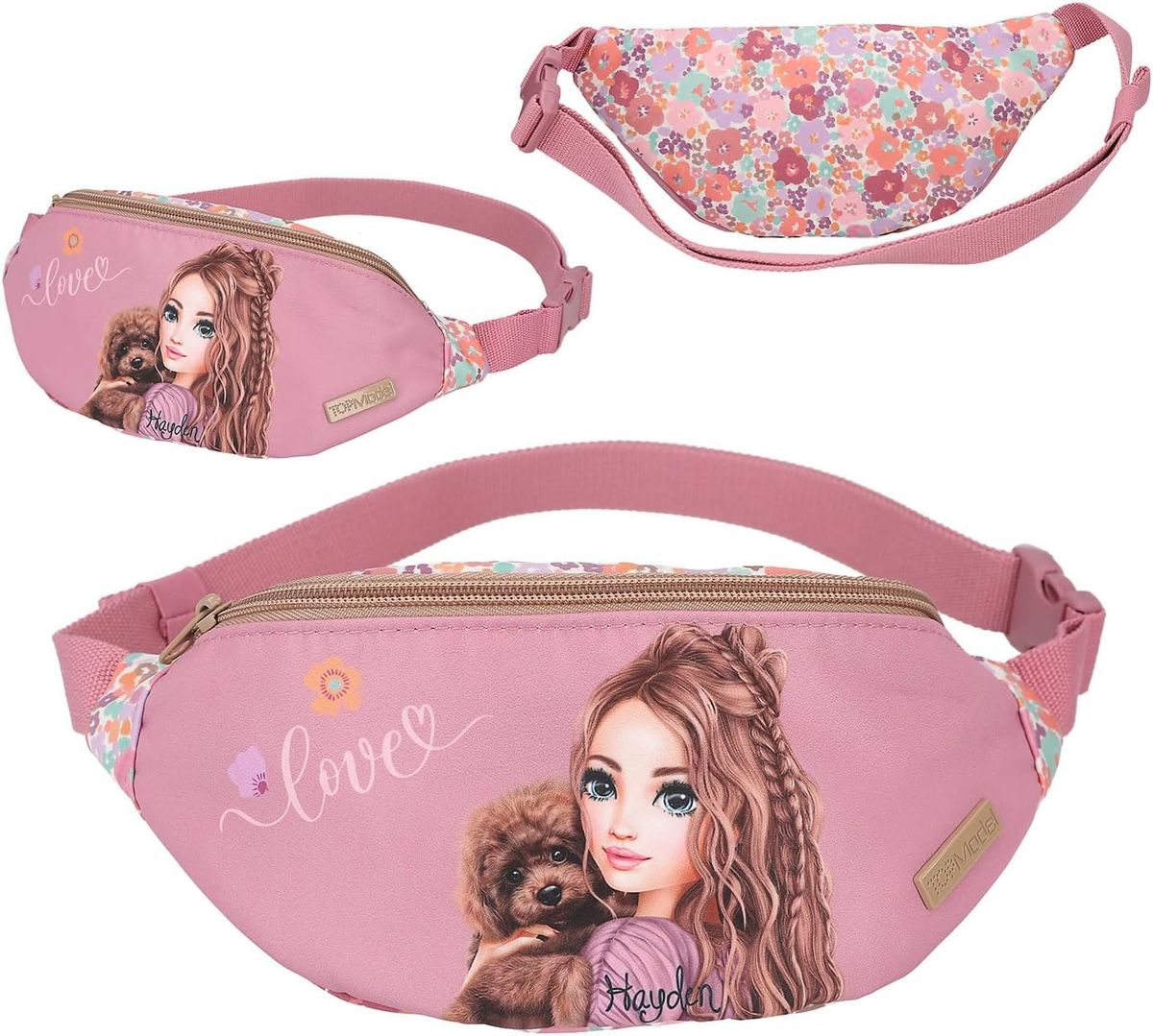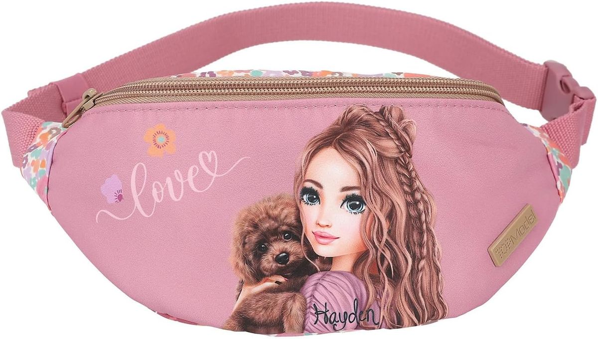 Questo marsupio della nuova collezione firmata Top Model può essere indossato in vita o a tracolla. Il motivo principale sul davanti color bacca raffigura una splendida modella che tiene in braccio un simpatico cagnolino, mentre il retro presenta una splendida stampa floreale e cuciture a forma di diamante alla moda. Ideale come regalo, per giocare o da collezionare, questo articolo stimola la creatività, l'immaginazione e il gioco di ruolo nei bambini di tutte le età. Perfetto per gli appassionati del marchio e gli amanti del design divertente.