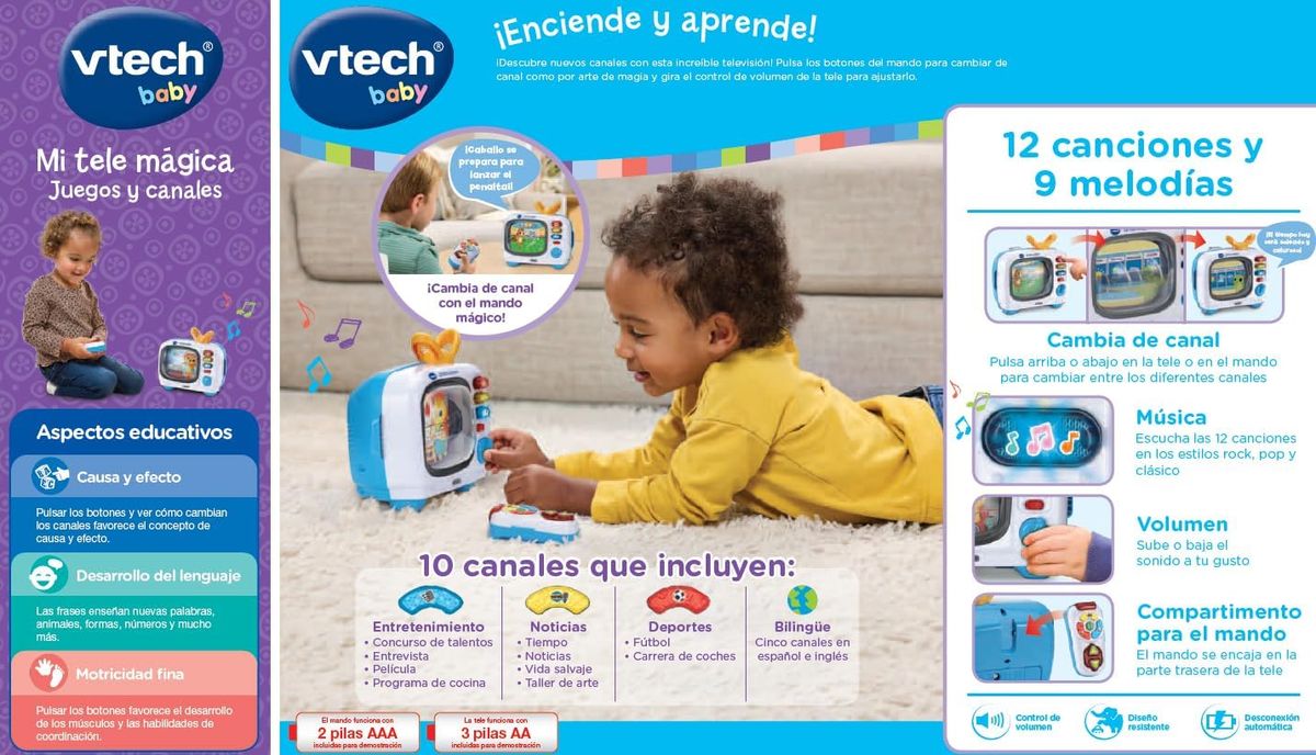 Girando la ruota e premendo il telecomando, il tuo piccolo diventa il presentatore. Lo schermo illustrato, privo di batterie o componenti elettronici, offre 10 scene che cambiano a ogni giro, allenando la coordinazione occhio-mano e l'idea del "se faccio questo, succede quello". Il telecomando illuminato apre tre sezioni (Notizie, Intrattenimento e Sport) e, con un pulsante centrale, passa dallo spagnolo all'inglese per ampliare il vocabolario e sviluppare le capacità di ascolto di nuovi suoni. Tra animali, meteo, cibo, forme, numeri e musica, i canali li invitano a classificare e riconoscere concetti in modo divertente. I pulsanti del volume insegnano loro come alzare e abbassare automaticamente il volume, e lo spegnimento automatico risparmia le batterie per un gioco sicuro.